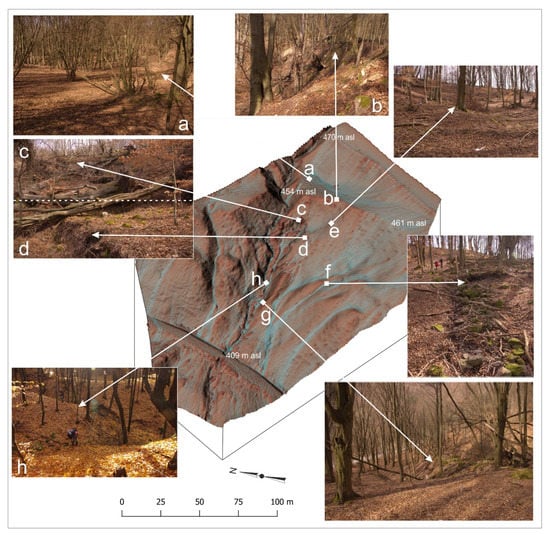 Undetected landslides may be considered as elements at risk if they threaten urbanized areas and related infrastructure []. Remote sensing techniques are commonly used to detect, map, and monitor slope failures [,,,,,]. However, recognizing micro-scale landforms indicative for slope instabilities as tension cracks, minor scarps, or undulating terrain remains a challenge for field surveys performed by remote sensing technologies, especially when forested and rugged terrains are subjects of field surveys [].