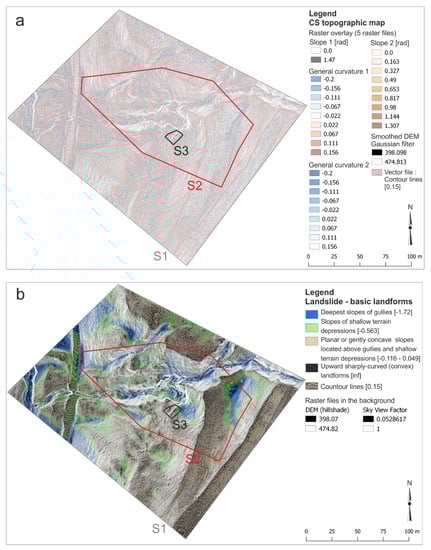 Delineation of a gully related landslide system in a digital elevation model (DEM) generated from point clouds acquired by aerial laser scanning using the LiDAR technology applying the (a) CSMapMaker QGIS plugin and (b) Raster operation. The depth of valleys was deducted from multiplied raster files of maximal curvature and sky-view factor, and the output raster indicates basic landforms of the investigated landslide.