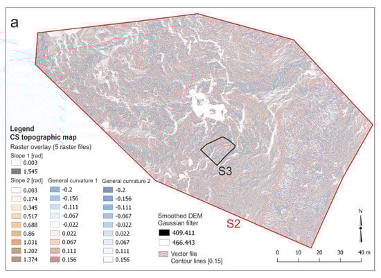 QGIS CSMapMaker produced similar terrain visualizations to a red relief image map (RRIM) [] which is a patented method especially developed to visualize the topographic detail acquired by LiDAR. It is a 3D visualization method [] for topography using the chroma of red color to show slope and the brightness of red color to show ridge-valley values calculated from DEM []. The CS topographic map comprised two rasters of slope, two rasters of general curvature which were all overlayed as 50% transparent rasters and smoothed DEM without transparency, and smoothed DEM. Valleys and ridges were depicted by bluish and reddish colors, respectively []. The chroma of red color was in the raster layers Slope 1 (grey shades) and Slope 2 (red shades). Slope was calculated in radians. General curvature 1 had the sequence of blue and red shades, and General curvature 2 had the sequence of blue shades. The DEM was smoothed with Gaussian filter and placed under the slope and curvature rasters. Further technical details are available in documentation for the CSMapMaker plugin [].