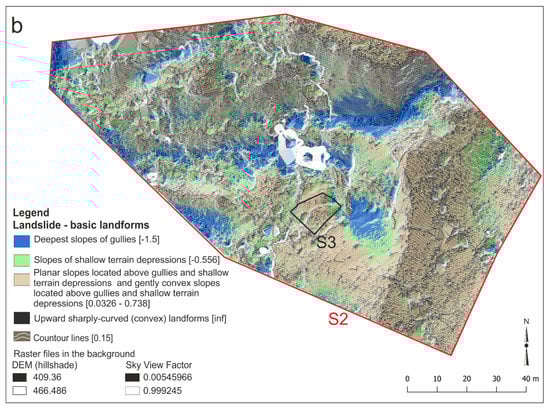 CRP performed by the SfM method brought data of high quality and allowed visualization of micro-scale landforms in detail at a scale of 1:100. Thus, it would be easy to obtain relatively precise measurements regarding data accuracy of a particular technology and raster resolution applied for the DEM created from point clouds. While a steep tear-off slope of a minor scarp appears as an exact black color in the raster (Figure 5b), the CSMM plugin for the delineation of landslide landforms generated the tear-off slope as contrast of linear labeled colors demonstrating the steepest and the most rugged convex and concave landforms (Figure 5a).