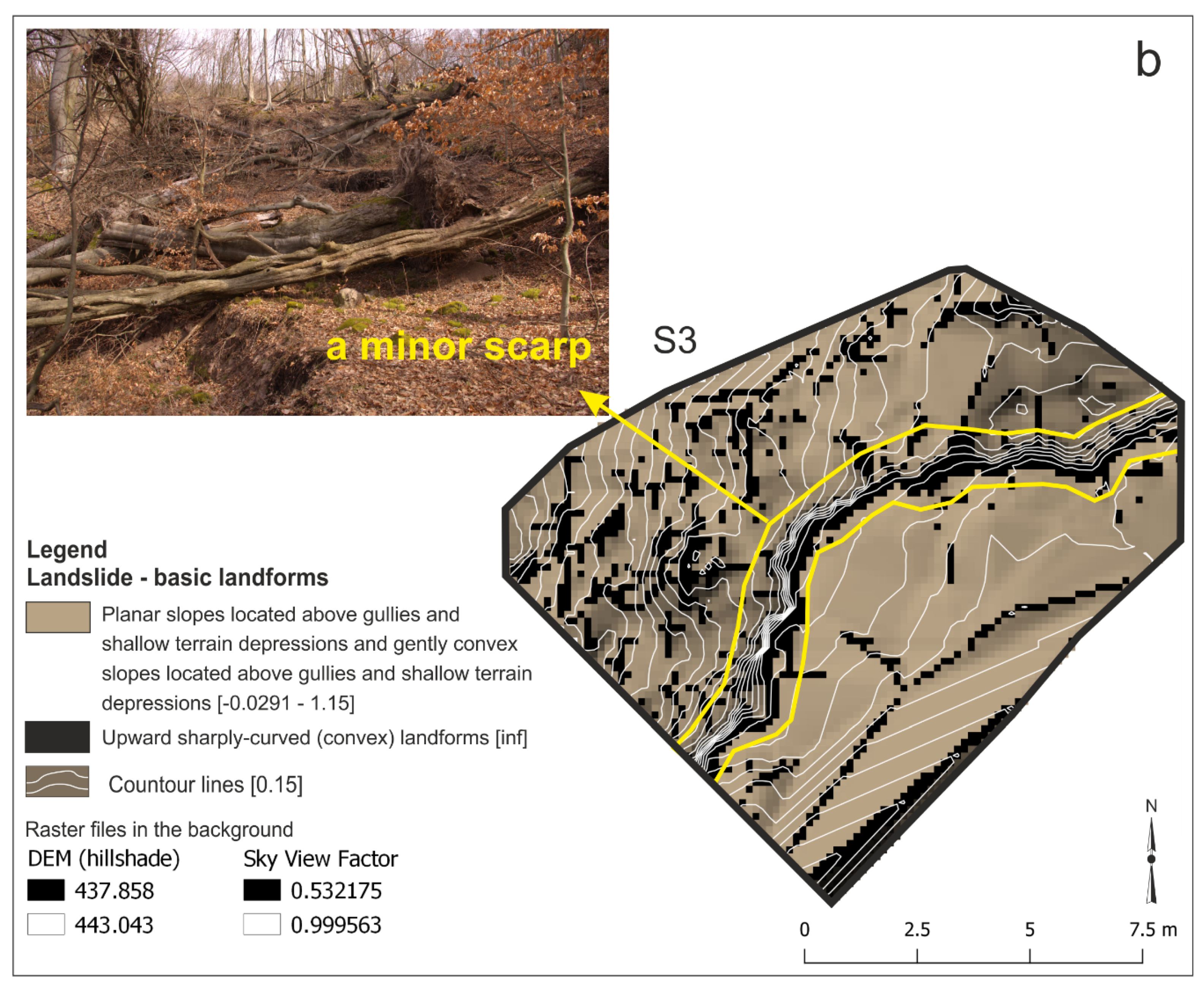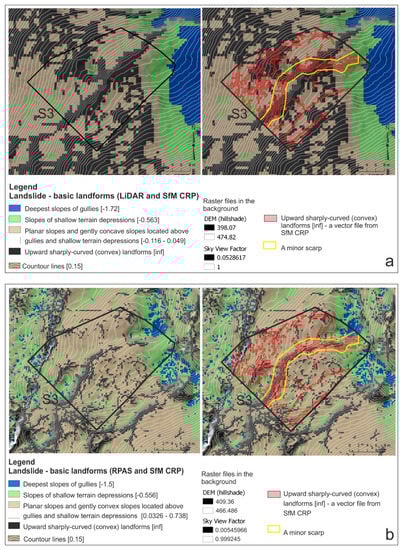 Delineation of a minor scarp in a DEM generated from point clouds acquired by aerial laser scanning using the technique of close-range photogrammetry using ‘Structure-from-Motion’ method (SfM CRP) applying the (a) CSMapMaker QGIS plugin and (b) Raster operation. The depth of valleys was deducted from multiplied raster files of maximal curvature and sky-view factor, and the output raster indicates basic landforms of the investigated landslide.