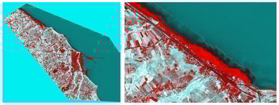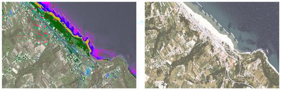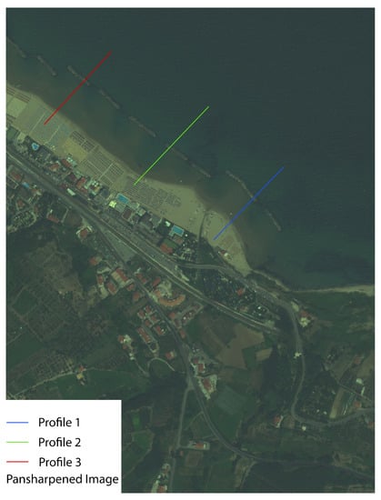 - Satellite remote sensing [21,22]: This refers to the latest-generation remote sensing satellites, which are becoming more effective as compared to those available previously. Traditionally, medium resolution satellites (e.g., Landsat and Sentinel-2) have been used advantageously for coastline studies that did not require very high accuracy. Satellites with high and very high resolution are required because they are particularly advantageous compared to traditional photogrammetric aerial acquisitions. High spatial resolution remote sensing satellites allow data to be acquired and processed more quickly, with comparable precision, while offering a very high level of detail. Furthermore, the fundamental ability to capture the scene in several spectral bands allows more information to be extracted than is extractable from images covering only the visible part of the electromagnetic spectrum and thus allows thematic maps of the territory to be created through multispectral classification. Another advantage, which makes this technique more attractive than the others, is that satellite revisit times are very short (a few days), which allows the area to be studied on images taken at different times.