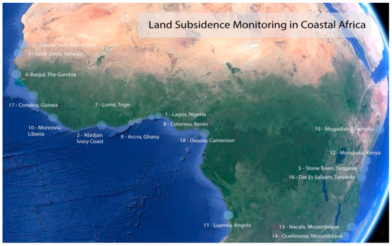 Figure 1 shows the 18 cities in sub-Saharan coastal Africa that were analyzed by InSAR to detect possible land deformations, in particular land subsidence. The study was conducted using mainly two sources of data: (i) Envisat-ASAR data on board the European Space Agency’s Envisat, active from 2002 to 2012 [52]; and (ii) S1 data active from late 2014 to today.