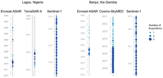 Concerning the two case studies presented, for Lagos we were also able to access the TSX dataset and for Banjul we had access to CSK data. This allowed us to perform a higher-resolution analysis, given the 3 m resolution of these products.