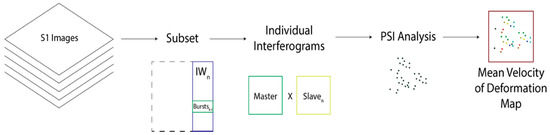 As shown in Figure 3, the first step was to create a subset of the n available S1 images. S1 images were divided into 3 sub-swaths. In most of the cases, the city of interest was contained in a single sub-swath. Each sub-swath is composed of several bursts (longitudinal portion of the image). Therefore, to create the subset, we selected the sub-swath containing the area of interest and the bursts covering exactly the area of interest [25]. This allowed us to reduce the size of data and speed up the processing. The second step was to compute individual interferograms, combining the master image with the remaining n slave images. Subset and interferogram computation was performed using SNAP open source software [63]. The stack of n individual interferograms was given as input for the PSI analysis (third step), where PSs are identified and analyzed. This step was performed using the StaMPS open source toolbox [46,64] for Matlab®. The toolbox gives as output the map of mean velocity of deformation for all the PSs in the area of analysis, as well as their deformation on each date of observation and the mean standard deviation of the velocity of deformation throughout the whole time series. Additionally, for the atmospheric phase removal of the data, we employed the Toolbox for Reducing Atmospheric InSAR Noise (TRAIN) [65] and applied the linear approach (phase versus elevation).