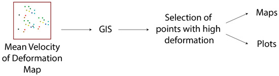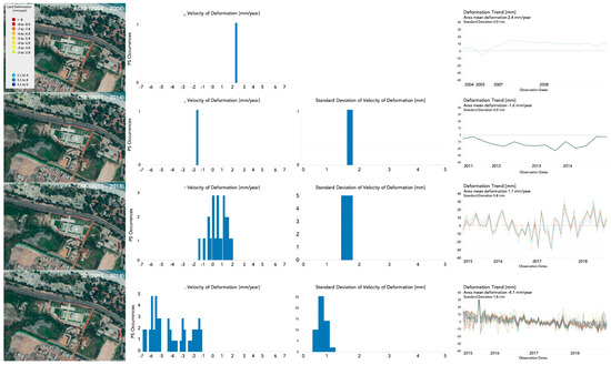 In workflow (iii) (Figure 4), the land deformation maps are loaded in a GIS, where points showing deformation greater than or equal to ±2 mm/year are selected and analyzed. For each area showing interesting behavior (AOI), 3 plots are produced: (i) a plot showing the distribution of velocity of deformation values for all the analyzed points, (ii) a plot showing the distribution of the standard deviation values of the velocity of deformation for all the analyzed points and (iii) a plot showing the deformation trend of each point measured at each time step of the time series. The plots allow us to understand the average behavior of the points inside the AOI. The first plot indicates the average deformation (subsidence, uplift or stability), the second indicates the stability of velocity of deformation values and the third shows the trend of deformation along the time series.