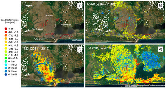 Figure 5 shows the results obtained for Lagos, Nigeria, using ASAR data for the period 2004–2010, TSX data for the period 2009–2012 and S1 data for the period 2015–2018. The points showing deformation between −2 and 2 mm/year were filtered out of the image as they are considered noise, as explained at the beginning of the section. Five areas of interests (AOIs) were considered for detailed analysis: northeast Lagos, east coast, city center, airport and northwest.
