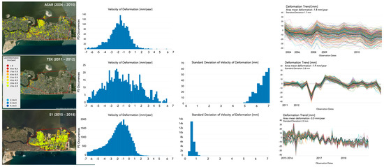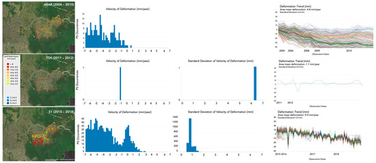The analysis carried out for the northwest AOI is shown in Figure 10. This area (Egbe and Ejigbo) does not show any significant change in the past 15 years. The results, as in the previous case, show varying behavior, with ASAR and S1 detecting few PSs, with a predominant slight uplift in the case of ASAR (0.3 mm/year mean deformation) and a predominant land subsidence in the case of S1 (−0.5 mm/year mean deformation) but with 2.4 mm/year standard deviation among the mean deformation of all the PSs. Using TSX, we detected thousands of points showing a strong signal of subsidence, with a distribution peak between −2 and −3 mm/year, hundreds of points with deformation greater than −5 mm/year. The distribution of the standard deviation in this case is centered around 3 mm, indicating some uncertainty in these measurements. This is also confirmed by the trendlines, showing a mean deformation of −2.7 mm/year with 2.5 mm standard deviation.
