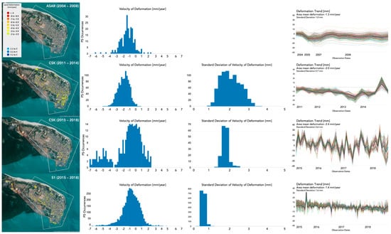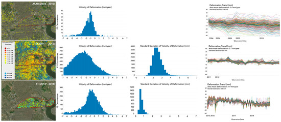 The analysis carried out for the airport AOI is shown in Figure 9. The results obtained with the three datasets show varying behavior, most probably because different periods of analysis experienced different deformation patterns. Using both ASAR and S1 data, we detected only a few PSs, most of them outside of the airstrip. In both cases, the distribution of values of velocity of deformation is centered around an uplift of 1 mm/year, for S1 with standard deviation below 1 mm/year. The trendlines show a mean uplift of 0.8 mm/year for ASAR and 0.4 mm/year for S1. However, the standard deviations of this mean uplift among all the analyzed points are 1.3 mm/year for ASAR and 2 mm/year for S1, indicating considerable variability.