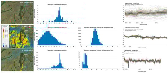 Regarding the datasets (Figure 2), the distribution of the 20 ASAR acquisitions is suboptimal, with sparse acquisitions from the beginning of 2004 to the end of 2010. Most of the acquisitions (12) are concentrated between the second quarter of 2009 and the third quarter of 2010. Instead, the distribution of the 98 S1 images is optimal, with acquisitions very well distributed from April 2015 to November 2018. Finally, the 23 TSX images are optimally distributed from November 2011 to November 2012.