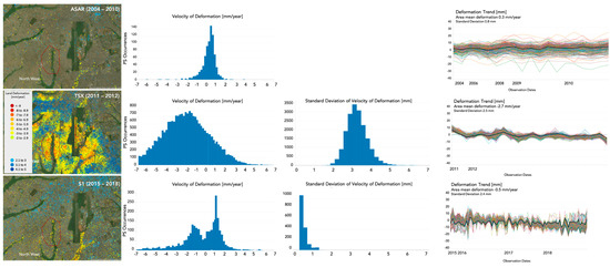 S1 in this case also appeared to have very reliable datasets, allowing us to obtain very precise measurements (characterized by low values of velocity of deformation standard deviation) and perform large-scale land deformation analyses.