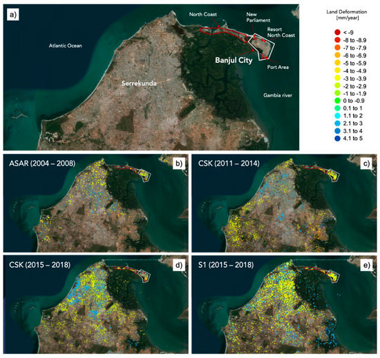 Land deformation results for Banjul, the Gambia, obtained using ASAR data for the period 2004–2008 (b), COSMO-SkyMed data for 2011–2014 (c) and 2015–2018 (d) and Sentinel-1 data for 2015–2018 (e). Points showing deformation between −2 and 2 mm/year were filtered out of the image as they are considered noise. Five AOIs were considered for detailed analysis, as shown in (a): Banjul city, new Parliament, port area, resort north coast and north coast.