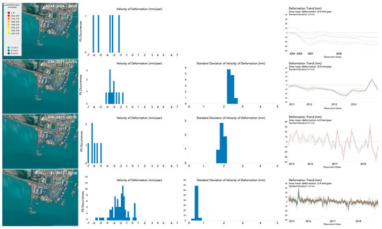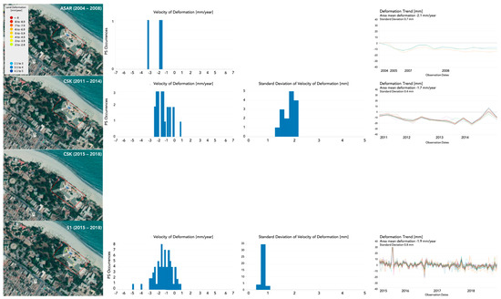 For each case study, five AOIs were selected and analyzed in detail. For each AOI, we produced three plots: (i) the distribution of the values of velocity of deformation, (ii) the distribution of the values of standard deviation of the velocity of deformation and (iii) the trend of deformation for each point analyzed through the whole time series, which shows also the overall mean velocity of deformation, that is, the mean of the mean velocity of deformation of each PS within the AOI and its standard deviation, that is, the standard deviation computed on the mean velocity of deformation of each PS within the AOI. The plots allow us to understand the magnitude of the deformation (velocity), its reliability (standard deviation) and its evolution over time (trend). In the case of ASAR data, the standard deviation was not computed (plot ii)).