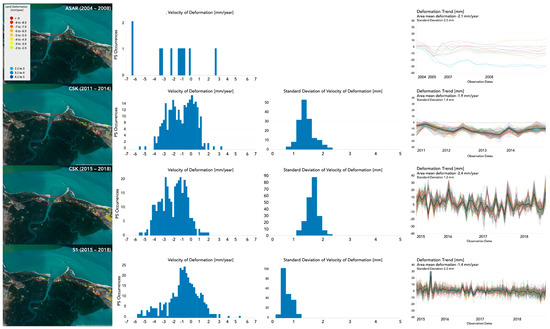 By looking at these results, we can immediately notice how higher resolution can bring more details. In fact, TSX is able to detect a higher density of PSs compared to S1 and ASAR, allowing the detection of deformation at building scale in case of good coherence throughout the whole time series. However, the big advantage brought by S1 is the frequency of acquisition, which increases the ability to detect PSs and the precision of measuring their velocity of deformation. This is evident by the distribution of the standard deviation values. On the contrary, ASAR, which allowed the analysis of land deformation in the past, has coarser resolution and few images not continuously acquired and not well distributed throughout its acquisition life. TSX, which has the advantage of higher resolution but is not freely accessible, also has a longer and discontinuous frequency of observation, which strongly affects the InSAR analysis.