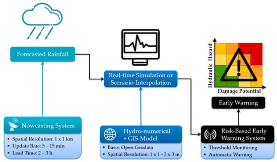 Design and process flow of the Risk-based EWS for pluvial flash floods [].