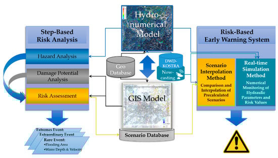 The risk-based EWS is one integral component of a MPFIS. The MPFIS performs the holistic analysis of historical, potential and forecasted heavy rainfall events. Besides the early warning module, the MPFIS integrates two independently-working modules, the documentation and the risk-assessment module. While the georeferenced documentation of past pluvial floods is used for understanding and model validation purposes, the risk analysis serves as a basis for the generation of pluvial flood-hazard maps and risk mitigation measures. Both modules represent the basis for the development of the EWS by providing the necessary model verification and procedure for risk assessment to build up an integrated system.