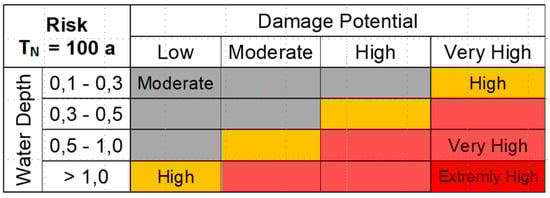 The flood risk estimation was carried out following the approaches of the two German guidelines, from the DWA [] and LUBW []. Due to the hydrological formation and hazard occurrence, the risk estimation process for pluvial flash floods requires a different approach than a standard process for river floods. In contrast to the standard process (e.g., Expected annual flood damage computation (EAD) from the US Army Corps of Engineers []) an over-flow frequency matrix for single rivers, or rather streams, may not be applied for pluvial flash floods. A heavy rainfall-induced flood cannot be associated with a certain discharge-return period (annuality) of one stream—a standard flow-frequency relationship is, therefore, not applicable. Rather, it consists of a complex interaction of different flooding-characteristics, e.g., surface flow, structural failure of the drainage system, overtopping of flow in watercourse, etc. In comparison to a standard derived damage-frequency matrix, this approach uses different graded risk evaluation matrices (flooding depth-damage relationship) for combined heavy rainfall-induced flash floods according to a certain probability of rainfall occurrence. In practice it means that, for example, a heavy rainfall event with a return period of 30 years has de facto a different graduation (risk classification) than an event with a return period of 100 years.