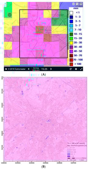 In recent years, the principle of open data has become increasingly more important worldwide. The availability and quality of freely-usable data is rapidly increasing, and with it the computing capacities of computer systems, especially in relation to high performance and cloud computing [,]. This area-wide high-quality information provides an idea, if not the basis, on which to develop a regional or even nationwide information system for analyzing and warning communities against pluvial floods.
