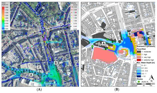 The automatized SQL-based risk analysis rests upon on a risk matrix which itself follows the approach of the DWA [] with the aim to guarantee a uniform risk classification and communication in Germany. It is based on the parameters, water depths and damage potential of infrastructure, as well as on the independence of the probability of occurrence of a heavy rainfall event. However, this method does not take the flow velocity or rather the flood impulse into account. Due to the fact that the hydrodynamic effect of flowing water is of crucial importance for risk evaluation, the modification of the method is proposed. The proposal provides the implementation of a risk matrix including the flood impulse as an additional parameter to assess the combined risk due to water level and velocity. Based on the classification presented in Table 4 or similar studies to the hazard level of pluvial flash floods for pedestrians, e.g., Martinez-Gomariz et al. []. However, the validation of simulated flow velocities represents the necessary criterion, and needs to be carried out first to ensure a consequent risk evaluation. Apart from that, the flood impulse values calculated in this case study were below the critical thresholds.