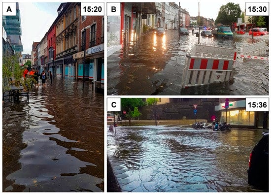 - Schmetz, O.; Esser, R. Die Innenstadt versinkt in Wassermassen: Schweres Unwetter trifft Aachen mit voller Wucht: Ungezählte Keller vollgelaufen, Straßen überflutet. Feuerwehr fährt 400 Einsätze. Aachener Zeitung, 30 May 2018. [Google Scholar]