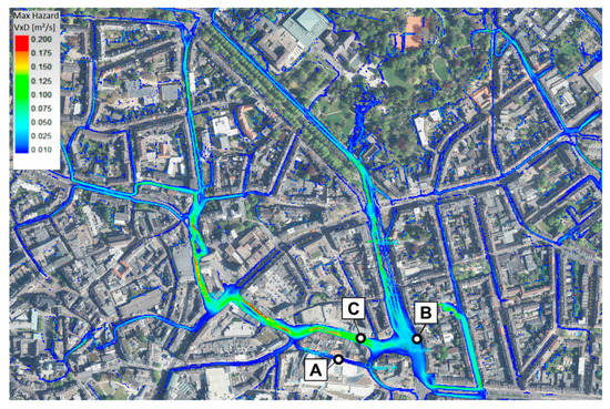 In the event of heavy rainfall, the safety of a population has top priority []. Therefore, an alarm system must warn the community with the highest possible effectiveness about the threats due to urban flash floods. The runoff processes of heavy rainfall events are highly complex and vary in space and time because of the variability of terrain, topography and urban structures. In this context, not only the hydrodynamic simulation of the flooding processes, but also the identification and analysis of critical infrastructure and high-traffic areas, are of great relevance. Power failures, failure of hospital facilities or cut off rescue routes are creating additional risks, and therefore need to be considered to ensure effective risk and disaster management.