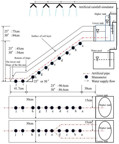 Overview of the equipment. We prepared slopes with two different gradients and set the depth of the soil layer to 20 cm. The water supply system consists of the higher and lower tanks, and artificial rainfall simulator. We supplied water from the water pool to the artificial rainfall simulator and the higher and lower tanks using a pump. We pierced the artificial pipe, which was made of vinyl chloride, so that water could pass through it. We installed the artificial pipe at the bottom of the model slope. Moreover, we measured the pore water pressure with a manometer attached to the bottom of the model slope.