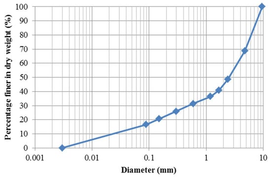 The particle size distribution of the dry experimental material, which we assessed, using a sieve, is shown in Figure 2. We collected samples from the remaining material and measured saturated hydraulic conductivity (4.53 × 10−3 cm/s). We measured cohesion (0.03 kgf /cm2) and peak internal friction angle (35.9°) using a triaxial compression test.