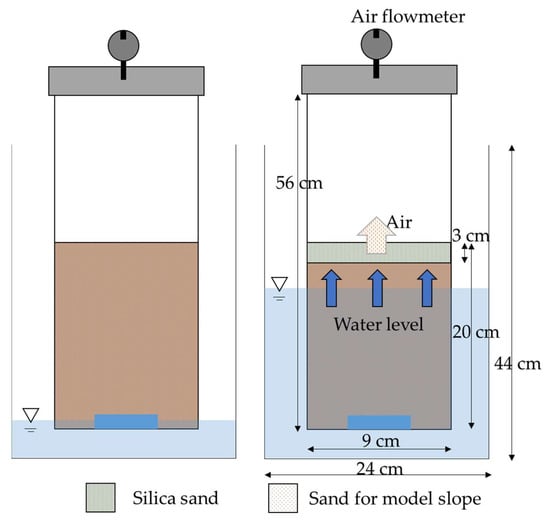 We placed 3 cm of silica sand on the surface of the model slope in Cases 4–6 so that we could assess the effects of entrapped air on landslide initiation. The particle size of silica sand is 0.003–0.3 mm. Hence, silica sand is much finer than the material used for the model slope. Furthermore, we carried out an experiment to test how effectively silica sand can entrap air in the soil layer. Figure 3 shows a schematic of the equipment used for this experiment, in which we tested two cases. In one case, we used the material sand pile and placed silica sand on top. In the other case, we only used the material sand pile. Acrylic cylinders were used for soil piles. Diameter and height of sand piles are 9 and 20 cm. The bottom of the sand pile was connected with a steel mesh to move air and water, and the top of the sand pile was free. Then, we put these sand piles in the water tank. Water level in the water tank was raised to the same level as the sand pile surface. Then, we monitored air flow rate from the sand piles using the flowmeter for air (FD-A1 by KEYENCE). Figure 4 shows the result of this experiment. In no silica sand pile, the air flow rate was 0.5 to 1.4 ml/s. And total discharge air volume in 600 s was around 3160 mL. In silica sand case, the air flow rate was almost zero until 200 s since the start of experiment. Then, the air flow rate increased, but the air flow rate was smaller than that of no silica case. Total air flow volume in 600 s was 2560 ml and 81% of no silica case. This indicates that the 600 mL of air might be entrapped in the sand pile in the silica sand case. Based on these results, we confirmed that silica sand can entrap air in the soil layer.
