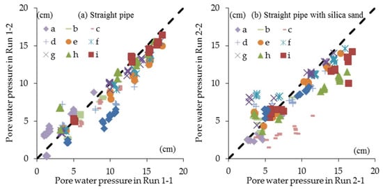 Comparison of pore water pressure at the same pint under the same water supply condition between Runs 1 and 2. The legend (a,b) indicates each manometer. The trend of each manometer was similar generally in two times.
