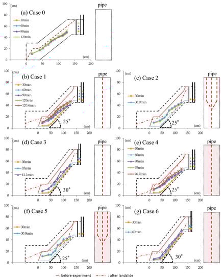 First, we discuss the effect of the pipe on landslide timing and form by comparing Case 0 to Case 1. In these cases, no clear displacement or landslide occurred until the water supply level reached 20 cm. However, in Case 1, when we set the water supply level in the higher tank to 25 cm, a landslide occurred. Here, when we used a higher tank, we expected the pressure in the pipe to increase. This implies that the presence of pipes in the soil layer has an effect on landslide occurrence.
