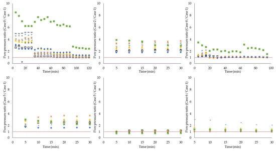 In Case 1, the pore water pressure was between 1.3 and 5.0 cm (pressure ratio: Between 0.2 and 0.4) when the water supply level reached 5 cm, and between 1.4 and 13.0 cm (pressure ratio: Between 0.2 and 0.8) when the water supply level reached 10 cm (Figure 7b). The pore water pressure continued to increase as the water supply level was raised to 15 cm, then 20 cm.