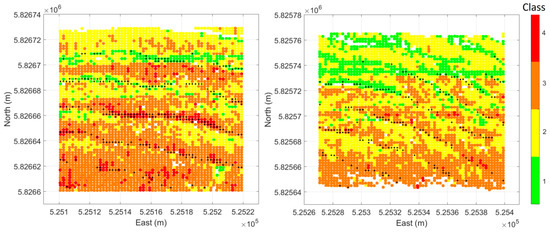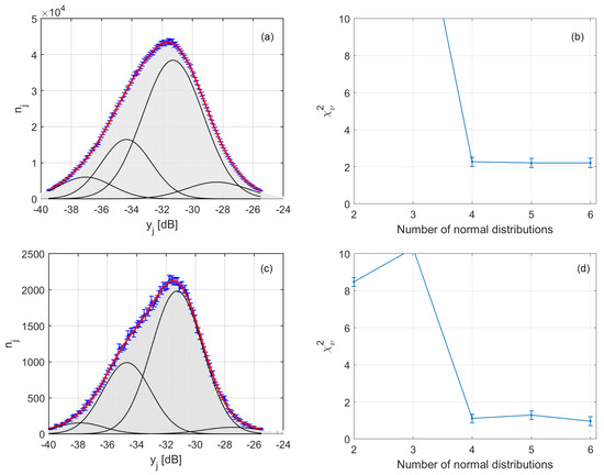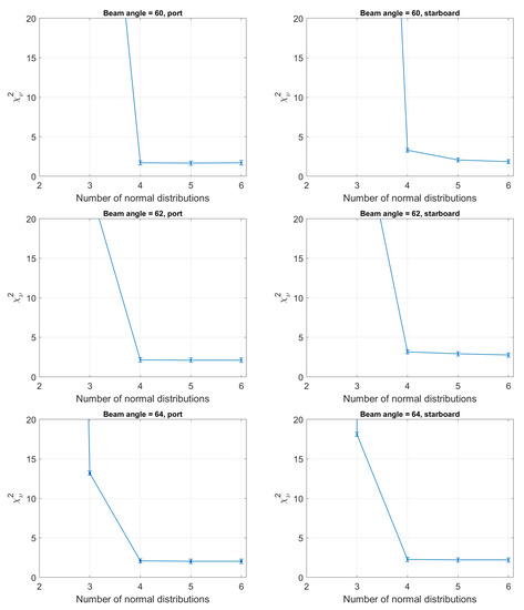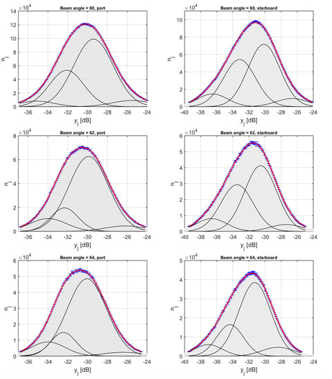 - The results obtained in Figure 15 show that the means and standard deviations of the Gaussians are characteristic of the acoustic properties of the sediment types. Given that the mean grain sizes of the grab samples suggested a homogeneous seabed in this survey area, it might be thought that if the parameters of the Gaussian were given a significant range within which they could vary, only one (or a few) Gaussians would be fitted to the entire histogram. The results show that this is not the case. For both datasets, the bounds for the standard deviation were set to a range of 0.5–2 dB but for neither dataset were the lower or upper bounds used after the curve fitting was implemented. This indicates that the Bayesian classification results are not significantly affected by the averaging procedure.