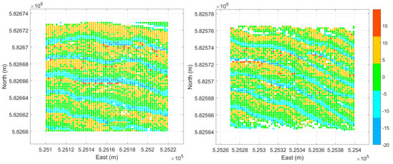 - The above averaging procedure can in principle reduce the noise of the backscatter data. This may, however, not decrease the standard deviation proportionally to the square root of the number of scatter pixels represented. This is because this rule is valid only for independent and identically distributed data. This cannot be the case for the backscatter data averaged over a small surface patch, because the variation and uncertainty in the BS data has independent and dependent components. The independent component is known as noise, which can be averaged out. This however does not hold for the dependent component, which is intrinsic to acoustic sediment properties and its heterogeneity. The fact that the two histograms in Figure 15 look similar also verifies the above reasoning; otherwise the second data set would have a significantly narrower histogram due to the averaging procedure.