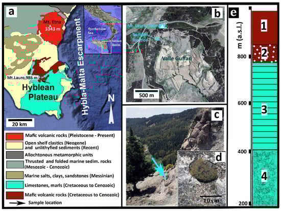 The xenolith sample was taken from the tuff-breccia deposits cropping out in the middle section of the head wall of Valle Guffari. This is a bow-shaped valley, cut in the southeastern slope of Mount Lauro (986 m a.s.l.), in the central part of the Hyblean Plateau (Figure 1). Submarine basalts, Upper Pliocene in age (Figure 1e), overlay the aforementioned Miocenic tuff-breccia at about 850 m a.s.l., testifying the significant uplift of this area in the last 3–4 Ma [24].