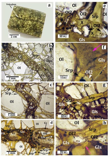 Macroscopic (a) and microscopic (b–h) pictures of the sample, with discussion as reported in the text. All microphotographs were taken under the optical microscope in plane-polarized light. (a) A small rectangular block cut in the host peridotite xenolith, used for thin-section preparation. The arrow indicates the silicate glass vein. (b) Detail of a thin section showing a typical segment of the vein. Full description is given in the text. (c) Microphotograph (plane-polarized light) highlighting that a short segment of the vein is intruded in a previous serpentine vein. Legend for (b) and (c): Gls = silicate glass; Ol = olivine; Srp = serpentine (± talc, ± chlorite); and Cc = carbonates (aragonite in most cases [51]). (d) Microphotograph showing veins of secondary carbonate minerals postdating the serpentine veins and the silicate glass vein. The connection between a carbonate vein and one of the carbonate vesicles in the silicate glass is highlighted. (e) Microphotograph showing the contact (reaction) zone between a narrow serpentine vein (Srp), perpendicular to the glassy vein, and the silicate glass (Gls). Ol2 = olivine microcrystals representing products of the serpentine dehydroxylation; X = amorphous and/or cryptocrystalline material produced by the serpentine breakdown (more explanation is given in the text). (f) Contact zone between a serpentine vein (Srp) and the vein glass (Gls). Here the reaction products form an opaque mineral-rich “plume” starting from the vein. The pink arrow indicates the opacitic “plume”. Other symbols as in previous pictures. More explanation is given in the text. (g) Microphotograph showing a contact zone between a serpentine vein (Srp) perpendicular to the glassy vein and the silicate glass. The area is crowded by tiny reaction olivine micrograins (Ol2). (h) Close view of the central area of the previous picture (g) highlighting the relationships between the serpentine (Srp) reactant and an olivine micrograin (Ol2) as one of the reaction products. The pink arrow indicates a relict shred of the serpentine reactant.
