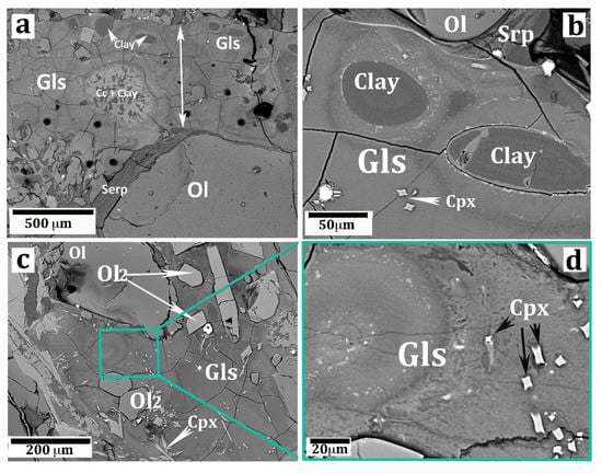 Observations in thin section under the optical microscope made it clear that the glass vein crossed the serpentine veins occurring along its track. Interestingly, a short segment of the glass vein coaxially intruded a segment of a serpentine vein (Figure 2c). Where an orthopyroxene grain occurred at the vein walls, the former appeared widely replaced by a selvage of reaction olivine micrograins, 1–10 µm in size, (e.g., right-bottom of Figure 2b). Many olivine (Fo87) micrograins and much smaller skeletal crystallites of clinopyroxene (Mg# = 75–81: Table 1; Figure 3b–d) were immersed in the glass. The olivine micrograins generally displayed rounded, tiny brownish inclusions considerably more Fe-rich than those from the harzburgite of unidentified material and magnetite (Figure 2e–h). In addition, many of vesicles filled with carbonate and/or clay minerals crowded the vein glass along its entire length (Figure 2b,c; Figure 3a,b). Some carbonate vesicles displayed an elongated shape according to the vein trend (Figure 2b) with their short axes being often as large as the vein width. One of the numerous carbonate veins irregularly crossed the sample, flowing into a carbonate vesicle present in the silicate glass vein (Figure 2d).