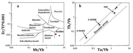 Despite the very low content in alkalis (Table 2), trace-element abundance (Table 3) and some distinctive element ratios (e.g., Nb/Yb = 3.4; Zr/TiO2 = 99 [63]; Nb/Yb = 45; Figure 4a), CeN/YbN = 23, indicates the alkaline affinity of the intruding high-Mg melt, which displays an OIB signature, e.g., ΔNb [1.74 + log(Nb/Y) − 1.92 log(Zr/Y)] = 0.5 [64]; Th/Yb = 4.4; Ta/Yb = 2 [66] (Figure 4b). It is worth to mention that geochemical and isotopic research on Hyblean alkaline volcanic rocks, such as alkalibasalts and nephelinites, indicated an OIB (and HIMU) signature in their mantle source [25,26,29,30,31].
