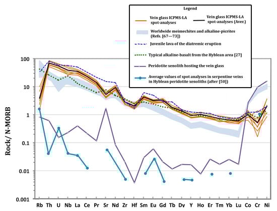 Compatibility diagram (sample vs. normal-MORB) of the vein glass ICPMS-LA spot-analyses, the juvenile lava of the diatremic eruption, a typical alkaline-basalt from the Hyblean area [27], the peridotite xenolith hosting the vein glass and the average values of spot analyses in serpentine veins in Hyblean peridotite xenoliths (after [50]) as indicated in the Legend. The shadowed area represents published analyses of worldwide meimechites and alkaline-picrites (References [67,68,69,70,71,72,73]). N-MORB normalizing values after [74].