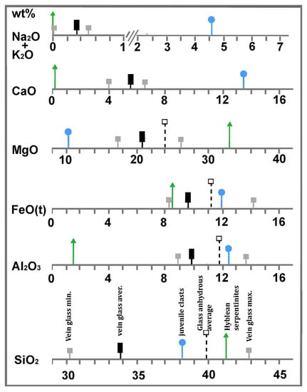 Synoptic table showing relationships between major element distributions (average) in the Hyblean serpentinites (triangle), the vein glass (rectangle), and the nephelinite volcanic rock that forms the juvenile clasts of the xenolith-bearing tuffsite breccia (circles). Full squares indicate minimum and maximum values. Open squares indicate average values recalculated on an anhydrous basis. Serpentine mineral analyses were reported after [50]. A full discussion is given in the text.