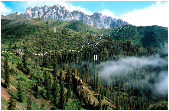 Overview on the sampling site near Qamdo: (I) area of predominant Juniperus tibetica tree-stands on southerly expositions at 4400–4600 m asl.; and (II) vegetation belt with the Picea balfouriana forest on southeasterly expositions.
