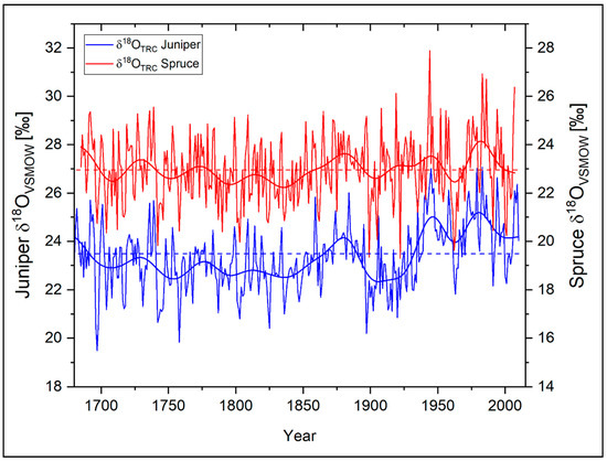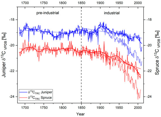 As displayed in Figure 4, even the corrected δ13CTRC time series do not indicate a uniform signal between species. In contrast to δ18OTRC, the δ13CTRC series reveal for both species a highly individual year-to-year variability as well as negative long-term trends. In addition, since 1900, a significantly more negative trend in spruce δ13CTRC values as compared to the juniper values is evident. By taking into account approximately comparable site conditions for both studied species, only certain internal physiological drivers can probably lead to the stronger depletion of the heavier 13C isotopes in the spruce trees. Thus, we assume that species-specific ecophysiological responses to increasing atmospheric CO2 or to increasing temperatures cause differences in the uptake of heavier 13C in the tree-rings. The impact of this changing external forcing and the resulting different response of the two tree species become even more impressive when considering the δ13CTRC in a multi-centennial perspective.