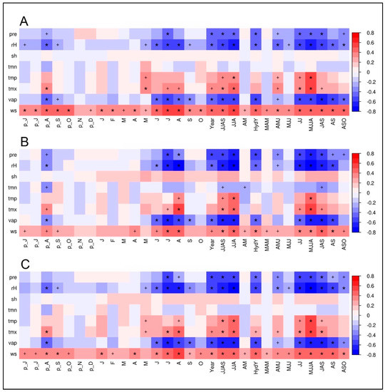 Climate–proxy relationships between δ18OTRC of: juniper trees (A); spruce trees (B); and the site-internal δ18OTRC mean (C) plotted against monthly and seasonal averages of different climate parameters (pre, precipitation; rH, relative humidity; sh, sunshine hours; tmn, minimum temperature; tmp, mean temperature; tmx, maximum temperature; vap, vapor pressure deficit; ws, wind speed) from Qamdo climate station for the period 1954–2007 (n = 54). The prefix “p” indicates relationships to the previous years’ monthly means. Red/blue colors indicate positive/negative correlation coefficients (r). The respective level of significance is displayed by a plus sign (p < 0.05) or an asterisk (p < 0.01).