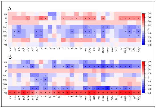 Climate–proxy relationships between δ13CTRC of juniper trees (A) and spruce trees (B) against different monthly and seasonal means of climate parameters (pre, precipitation; rH, relative humidity; sh, sunshine hours; tmn, minimum temperature; tmp, mean temperature; tmx, maximum temperature; vap, vapor pressure deficit; ws, wind speed) from the Qamdo climate station for the period 1954–2007 (n = 54). “p” shows relationships to the previous years’ monthly means. Red/blue color indicates a positive/negative correlation coefficient (r). The respective level of significance is indicated by a plus sign (p < 0.05) or an asterisk (p < 0.01).