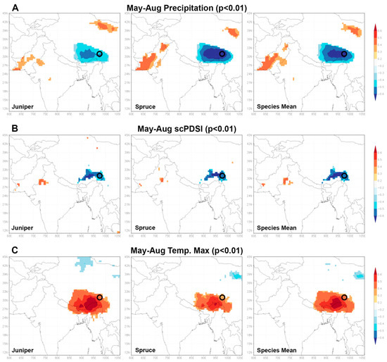 Spatial correlations (p < 0.01) of δ18O variations in juniper, spruce and the species’ mean (vertically arranged) with climate variables using the Climate Explorer. (A–C) Selected climate variables for the individual species (juniper and spruce) and the calculated δ18O mean of our study site for the summer monsoon season (May to August).