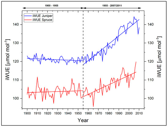 To initially test a possible individual response of our two studied tree species towards changing CO2 concentrations, we calculated for the period 1900−2007 their respective intrinsic water-use efficiencies (iWUE). As reported in [39], the iWUE is defined as the ratio of net photosynthetic assimilation rate (A) to stomatal conductance (gs) for water vapor. It is calculated as: