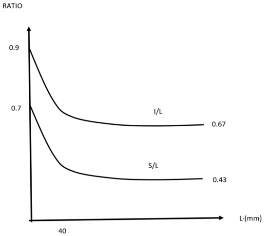 Shape was analysed using the length of the fragment, L, and its relationship to the dimensionless ratios (S/L) and (I/L) where S refers to fragment height and I refers to fragment width [5]. Within tafoni terminology, S equates to depth (D) and I equates to width (W). Figure 3 presents an idealized curve of the relationships identified between these ratios and fragment length. The graph shows a clear size dependence of fragment shape with fragment length expressed by the exponential relations: