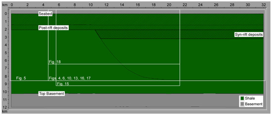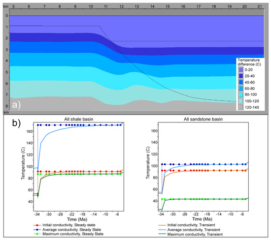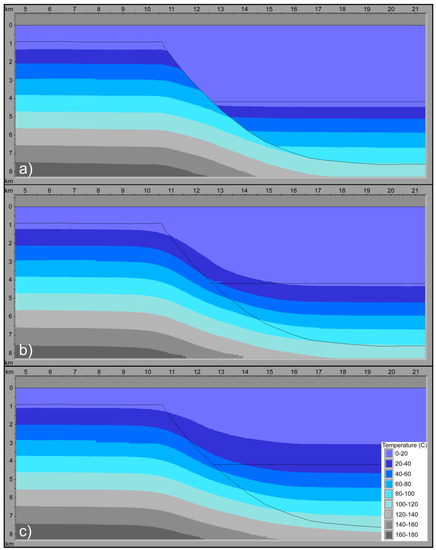 The syn- and post-rift deposits (Figure 1) in the studied section are 1800 m thick. These sediments are modeled to be deposited over five different time spans (Table 1); 20, 10, 5, and 1 Myr and 10 kyr, which correspond to a sedimentation rate of 0.09–180 mm·year−1. The sedimentation rate roughly overlaps the reported sedimentation rates (0.4–100 mm·year−1 for the referenced papers) (e.g., [69,70,71,72,73,74,75]). ter Voorde and Bertotti [29] suggest that the extension rate somewhat controls the thermal effect of sediment deposition. They argue that high sedimentation rates will temporarily cool the basin while low sedimentation rates lead to heating. According to their study the “turning points” are at sedimentation rates of 2.0, 2.2, and 1.4 mm·year−1 for shale, siltstone, and sandstone, respectively. Our results show that sedimentation rates > 0.18 mm·year−1 for shale result in basins with transient thermal effects, in agreement with results reported by Ehlers et al. [34]. The numerical temperature model is different in the two studies. Additionally, the resolution of the finite difference grid is much finer in our study as the focus is on a smaller part of the basin compared to the work by ter Voorde and Bertotti [29]. These elements may possibly be the reason for the different results.