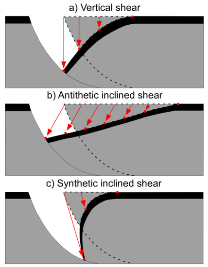 Illustration of the technique of (a) vertical simple shear, (b) antithetic inclined simple shear and (c) synthetic inclined simple shear. Antithetic simple shear results in a broader basin compared to for instance synthetic shear. Modified after Fossen [41].