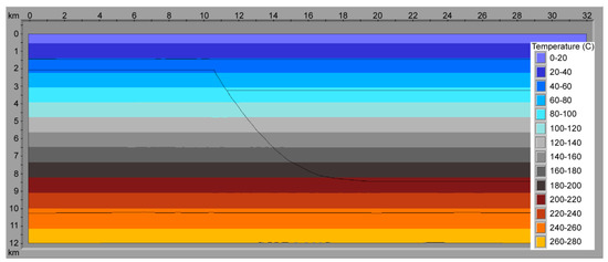 A basin not subjected to tectonic deformation undergoes a slow rate of erosion or sedimentation and has a gradual temperature increase with burial depth. Such a basin is in steady state [63]. On the other hand, structurally active basins may undergo sudden erosion or high influx of sediments, e.g., due to increased accommodation space during faulting, leading to abrupt changes in the geothermal gradient. When magmatic intrusions are emplaced into such active basins, the temporary, local change in temperature is not solely an effect of the hot magma intruding the system, but also due to transient thermal effects caused by structural development. Figure 3 shows the studied synthetic profile assuming thermal steady state with input parameters as given in Table 2.