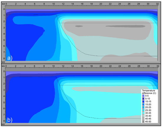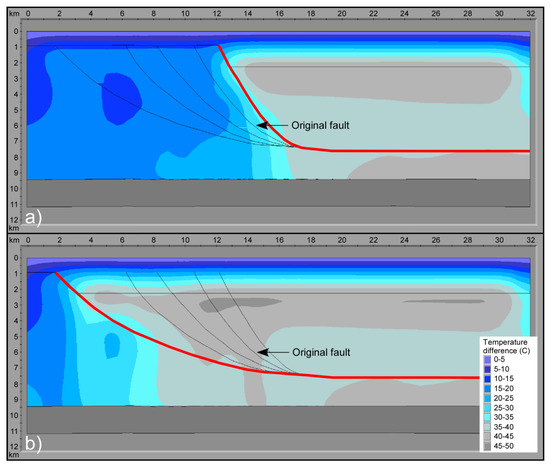 Temperature difference between steady state and transient model 10 kyr after fault slip for the steepest (a) and the least steep (b) studied listric fault.